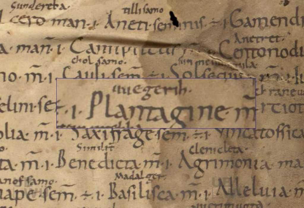 Auch im Deutschen zählt der Name Wegerich zu den ältesten Pflanzennamen, der schon um 800 in den sog. Basler Rezepten erscheint und anhand zahlreicher Belege im Althochdeutschen nachweisbar ist. In einem lateinisch-alemannischen Pflanzenglossar aus dem 10. Jahrhundert (Abb. 2) steht beispielsweise neben Plantago „vuegorich“ geschrieben. Ebenso wie in einem Rezept gegen Fieber, Gift und Schlangenbisse, wo „plantagine“ mit der Interlinearglosse „uuegerih“ erklärt wird (Abb. 3).
