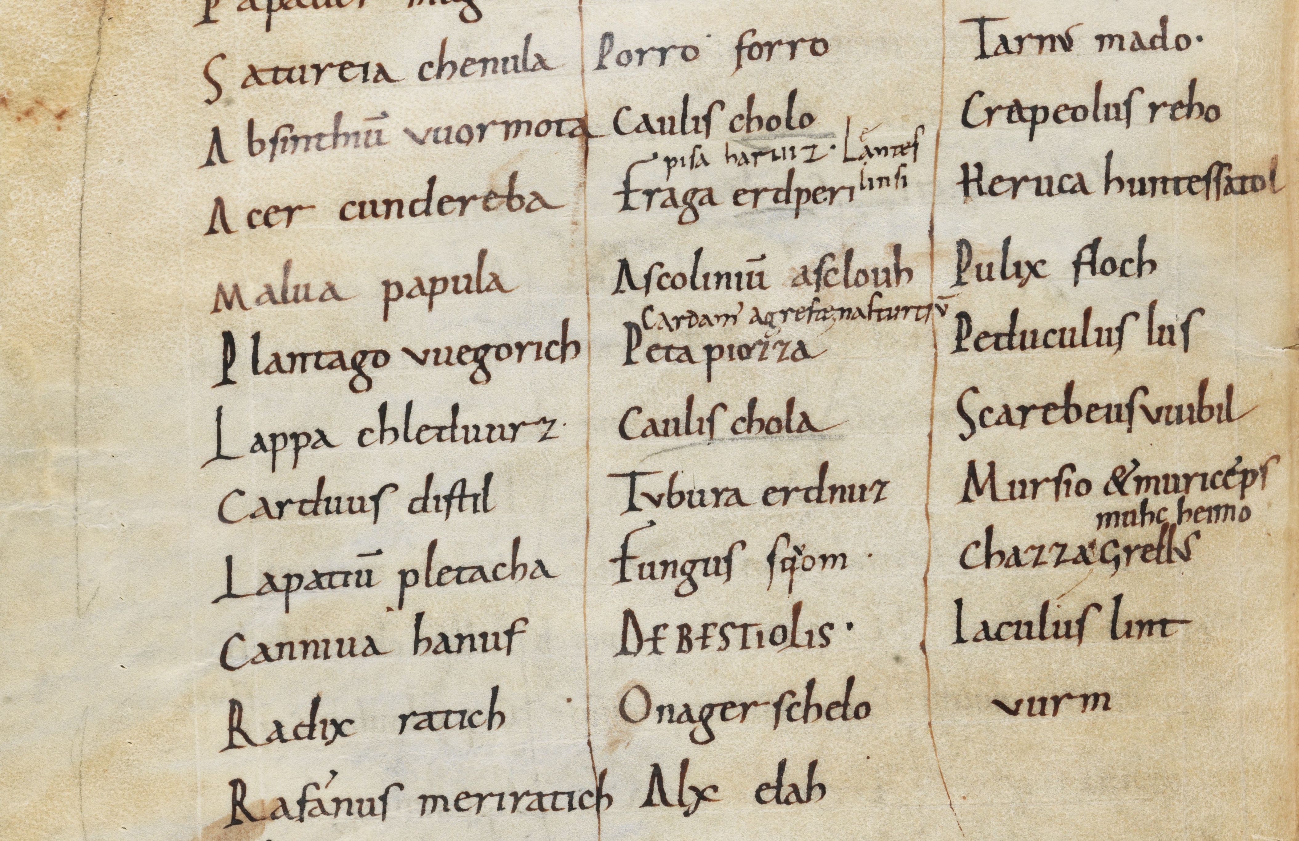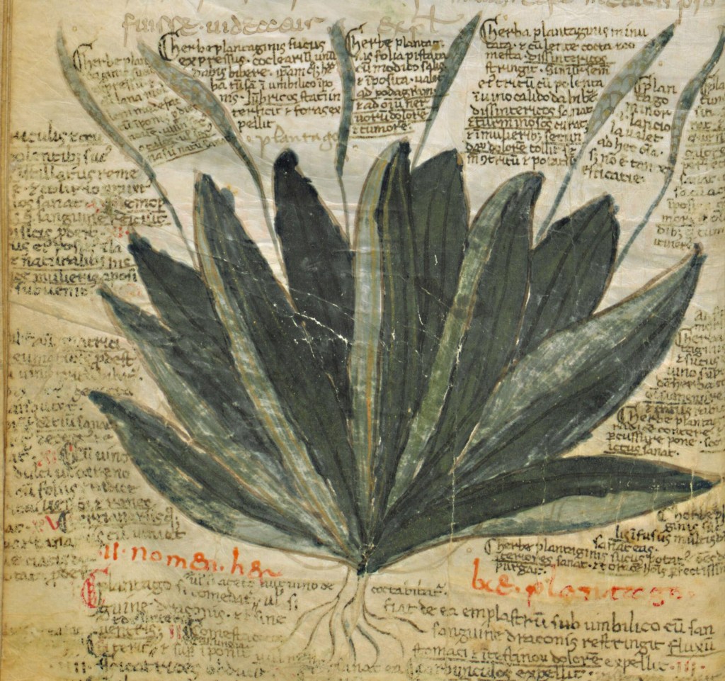 Plantago is the first plant with which the herbarium of Pseudo-Apuleius begins. This herbarium, which probably originated in the 4th or 5th century AD, is perhaps the most successful herbarium of the Western Middle Ages, the text often accompanied by copious images. With long dark green leaves forming a rosette and six spikes sprouting between them, the plantain, opens an Apuleius manuscript from the 9th century, which was most likely made in the Benedictine monastery of Montecassino (Fig. 1). The leaves of the front circlet create a kind of curvature at the outer edge of the leaf due to the lighter green shading, thus depicting the rosette shape of the plantain while creating a spatial effect. The numerous internal and external uses of plantago, such as for fever, gout or fresh wounds, are written by a later hand between the spikes and leaves and surround the plant like another circle. Nevertheless, in order not to lose orientation and to quickly find the desired effect of plantago, the scribe has underlined the respective field of application.