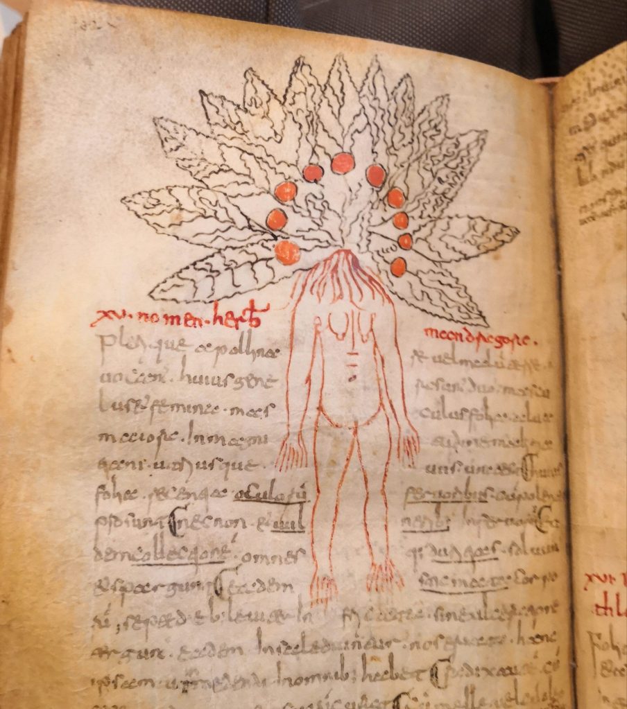 The late antique author of the herbarium could hardly have chosen a better plant than the plantago to begin his book on remedies useful to man. Moreover, Pseudo-Apuleius ends his book with the notorious Mandragora, whose root resembles a human body, which is why it is often depicted with arms and legs, as seen here in a manuscript dated to the 9th century (Fig. 4). What begins with the plantain as the plant that follows humans, ends with the anthropomorphic mandragora, which becomes the visual symbol of the unification of humans and plants.